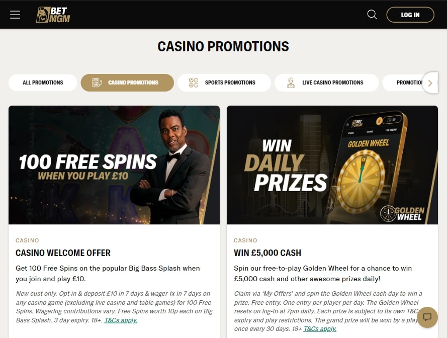 The current BetMGM UK casino bonus offer includes 100 welcome wager-free spins on the Big Bass Splash game, a sports welcome offer consisting of four free bets, mega jackpots, Golden Wheel that brings daily prizes, cashback, and a live casino bonus, and a free bet builder. Additionally, every BetMGM mobile casino player can participate in a prize contest and win a luxurious trip in Las Vegas.