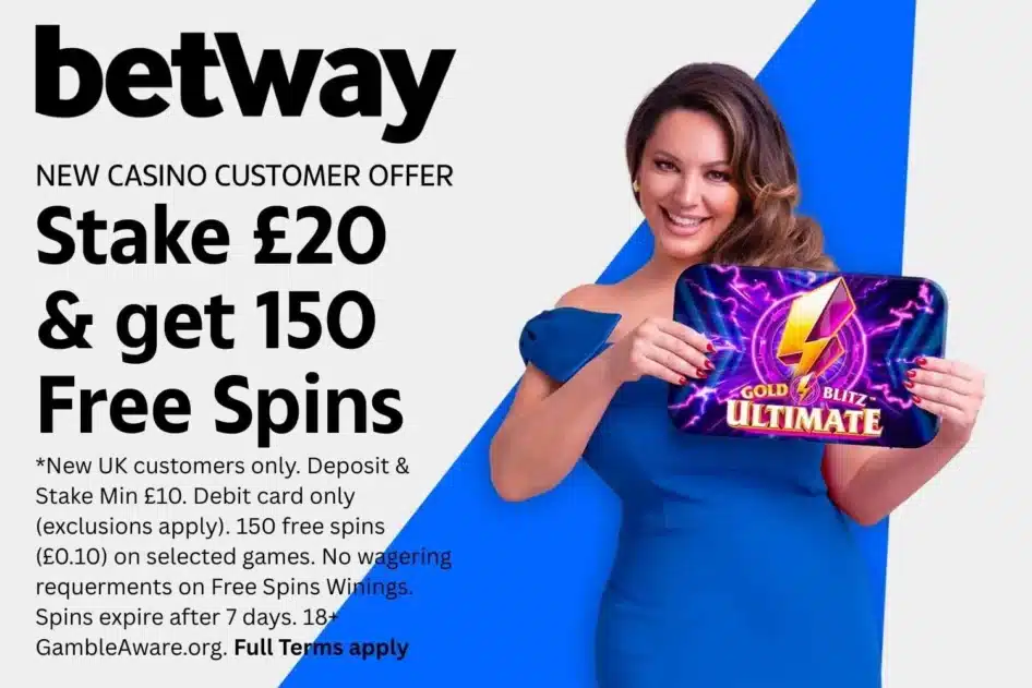 18+.New UK Customers only. Deposit and stake Β£20. Debit Card only (exclusions apply). 50 free spins credited daily over first 3 days, 24 hours apart. 150 free spins total. Spin value locked at Β£0.1 per spin. No wagering requirement on the winnings of the free spins. Spins expire after 7 days. Betway reserves the right to terminate the bonus in case players do not stick with the T&Cs. BeGambleaware.org