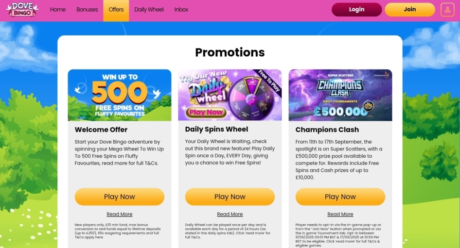 Dove Bingo is a UKGC licensed online casino and bingo site powered by Jumpman Gaming, offering over 1,000 games alongside classic 90 Ball Bingo rooms. New players can spin the Mega Wheel with a Β£10 deposit for a chance to win up to 500 Free Spins on Fluffy Favourites. With daily promotions, loyalty rewards and strong responsible gambling tools, it delivers a safe and feature packed experience, although the 65x wagering and Β£2.50 withdrawal fee should be considered.