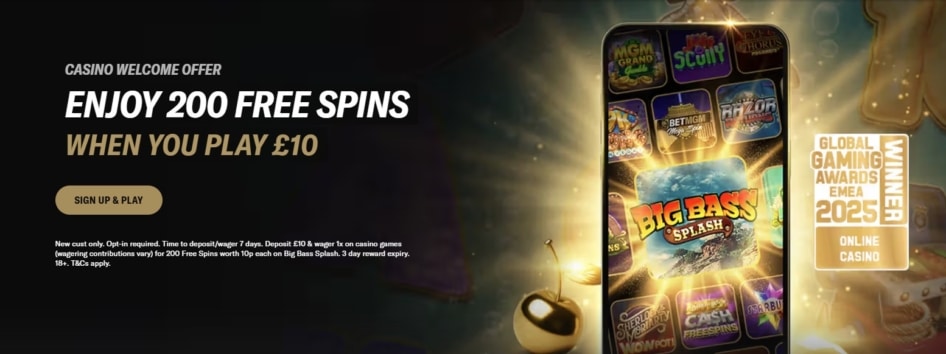 New cust only. Opt-in required. Time to deposit/wager 7 days. Deposit Β£10 & wager 1x on casino games (wagering contributions vary) for 200 Free Spins worth 10p each on Big Bass Splash. 3 day reward expiry. 18. T&Cs apply. BeGambleaware.org.
