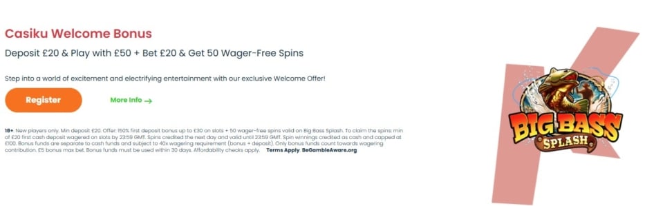 To qualify for the Casiku Casino registration bonus, new players must deposit a minimum of £20 and the 150% deposit boost will be added to your account. Additionally, if you spend that £20 playing slots within the first seven days you will receive 50 free spins.