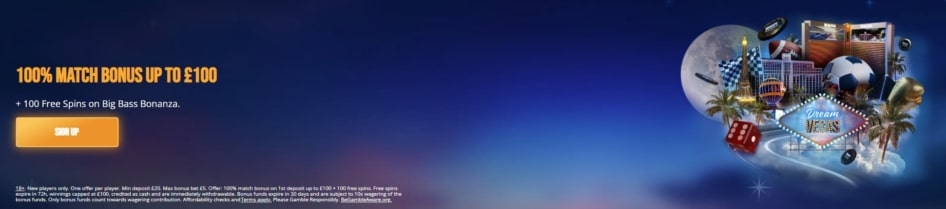 Deposit min of £20 up to £100 to get a 100% deposit match offer + 100 bonus spins on Big Bass Bonanza Games slot |