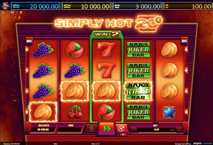 The Simply Hot 20+ online slot from Czech developer Kajot Games is another addition to the family of classic fruit slots that have enjoyed long-term popularity among players of all generations. If you’re a fan of simple, clear-cut game mechanics but you’re also looking for something extra – something that freshens up your play while keeping that traditional atmosphere – then Simply Hot 20+ might pleasantly surprise you. The slot is built on the standard layout of 5 reels, 3 rows and – as the name suggests – 20 fixed paylines.