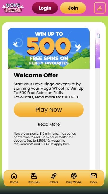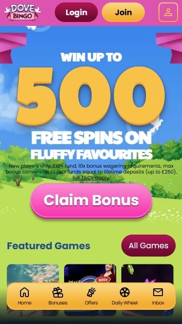 Dove Bingo is a UKGC licensed online casino and bingo site powered by Jumpman Gaming, offering over 1,000 games alongside classic 90 Ball Bingo rooms. New players can spin the Mega Wheel with a Β£10 deposit for a chance to win up to 500 Free Spins on Fluffy Favourites. With daily promotions, loyalty rewards and strong responsible gambling tools, it delivers a safe and feature packed experience, although the 65x wagering and Β£2.50 withdrawal fee should be considered.