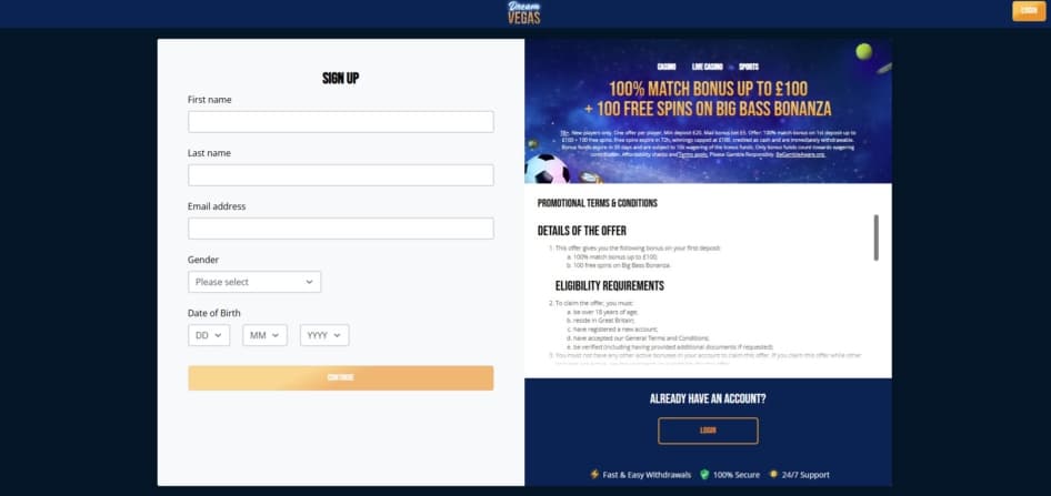 Dream Vegas Casino invites UK players to a luxury gaming experience with a slick interface, over 2,800 games, and a warm welcome bonus of up to Β£100 + 100 free spins. Signing up takes just a few minutes, and youβll be spinning top slots like Big Bass Bonanza! in no time, whether on desktop or mobile. Itβs fast, fun, and full of rewards!