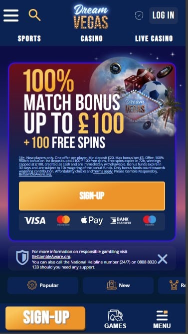 To get started with mobile Dream Vegas registration, you’ll need to tap the golden “Sign Up” button. You’ll find it at the centre of the mobile casino page.