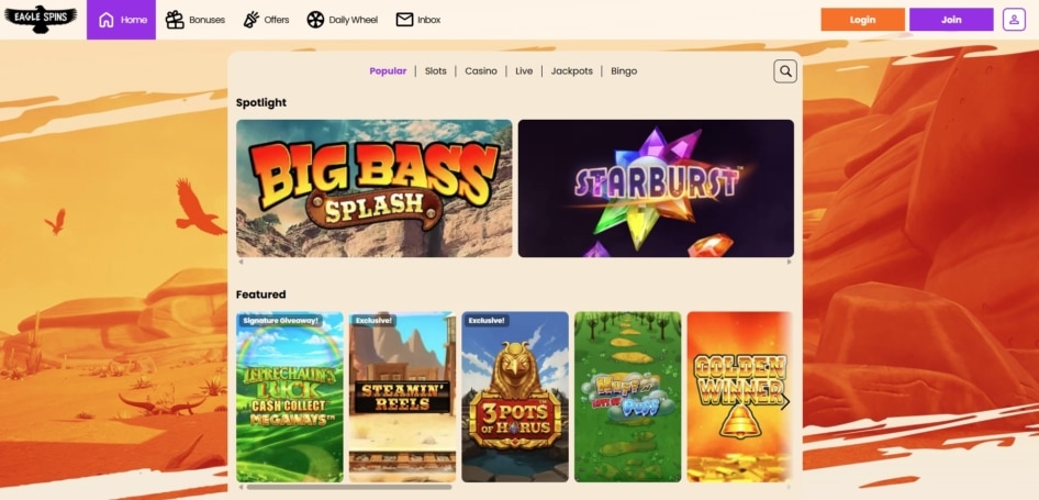 Registering at Eagle Spins opens the door to a casino packed with slot games, regular promotions and exciting bonus opportunities. The 100% welcome bonus up to £200 provides a solid starting point for new players who want to explore the platform.