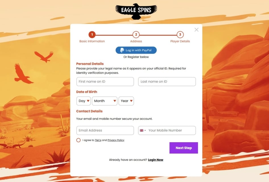 Registering at Eagle Spins only takes a few minutes. After opening the website, click the Register button and fill in the short sign up form with your basic details such as email address, date of birth and preferred login information.