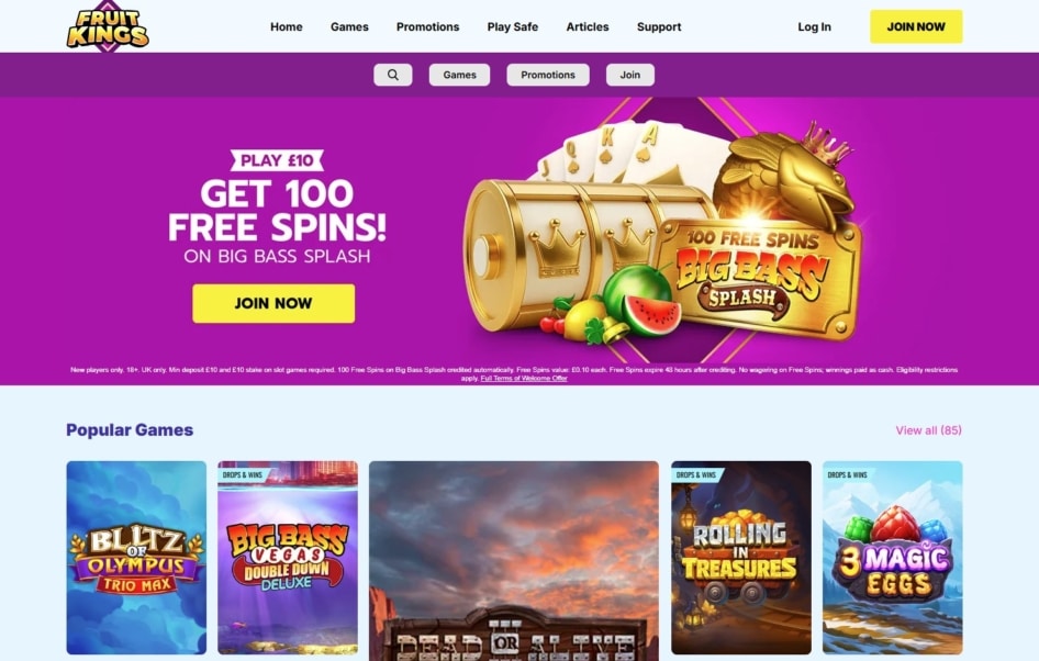Fruit Kings Casino is a vibrant and secure UK-licensed platform offering over 1,000 games, a 100% welcome bonus up to Β£50 + 100 free spins, and fast banking options. While customer support isn’t 24/7, the smooth withdrawals, exciting promotions, and trusted payment methods make it a solid choice for online casino enthusiasts. With an 85% rating, itβs a fun and rewarding destination for players seeking a well-rounded gaming experience.