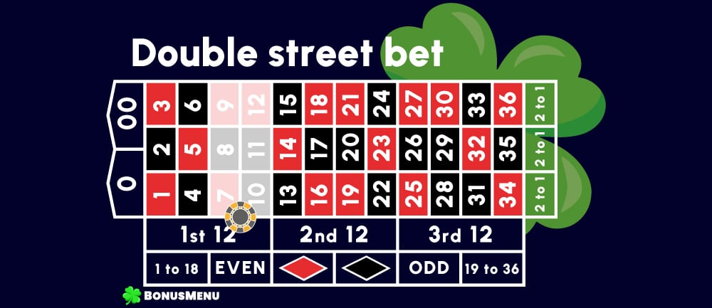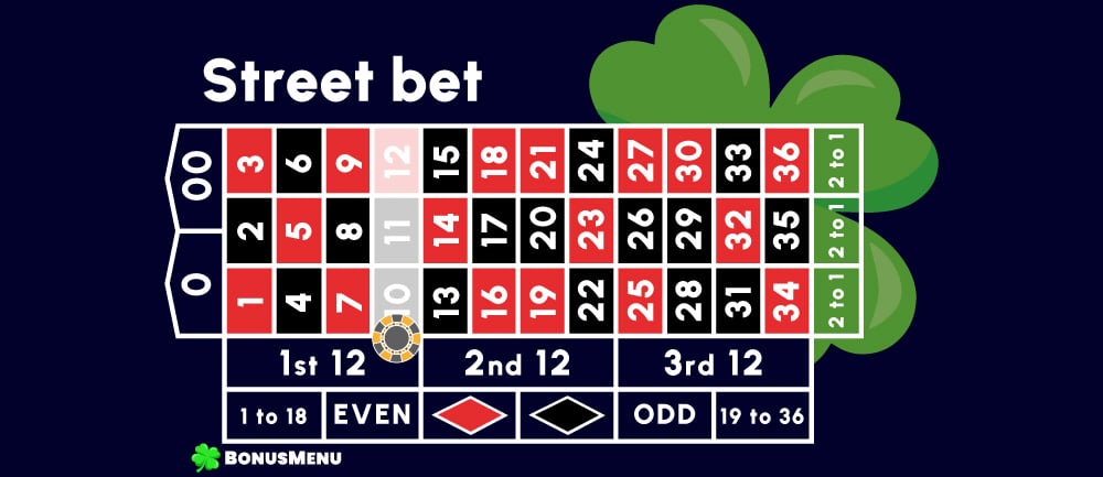 In this case, you are betting on three numbers in the vertical column – for example, 7-8-9. The chip is placed on the line above or below this column. A win pays 11 to 1.