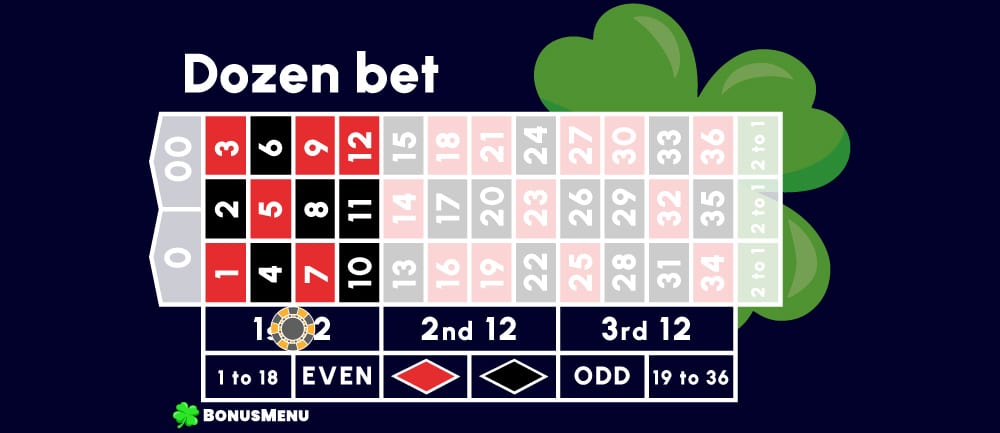 Bet on numbers 1-12, 13-24 or 25-36. A win pays 2 to 1.