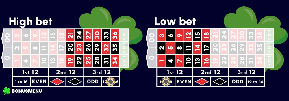 You bet low 18 on numbers 1 to 18, high on 19 to 36. A win pays 1 to 1.