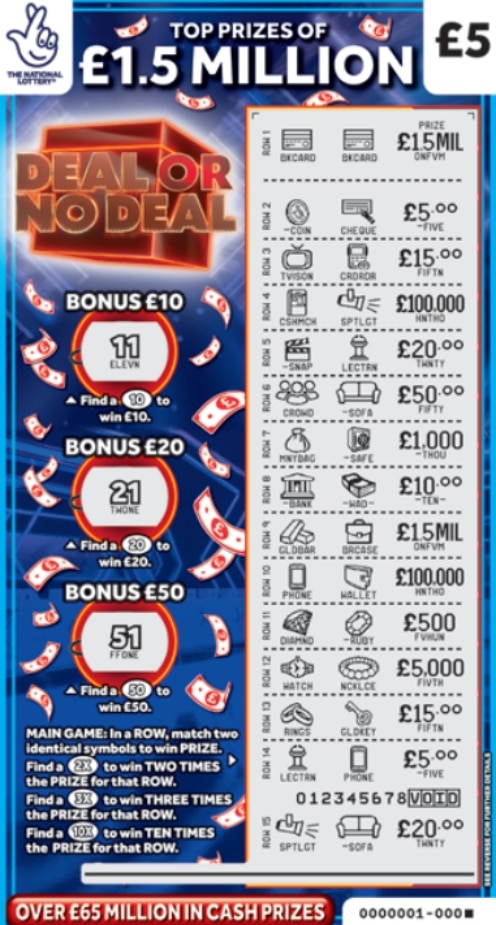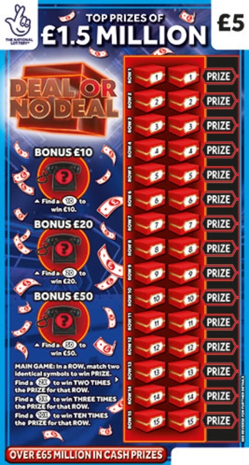 Step into Deal Or No Deal by The National Lottery, the Β£5 scratch card that brings the iconic TV show excitement straight to your hands. Scratch to reveal prizes and see if you can uncover the Β£1,500,000 top prize. More