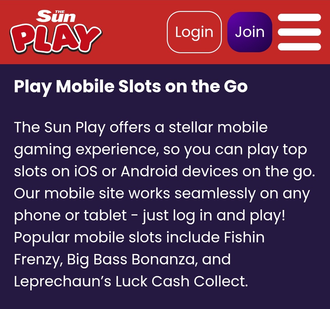 Itβs perfect for those spontaneous gaming sessions, for filling those awkward five-minute gaps in your day, or for simply enjoying your favourite slots from the comfort of your couch. Sun Play Casino delivers a robust, enjoyable, and surprisingly humorous mobile gaming experience. Go on, give it a whirl β your thumbs will thank you, and who knows, your wallet might too!